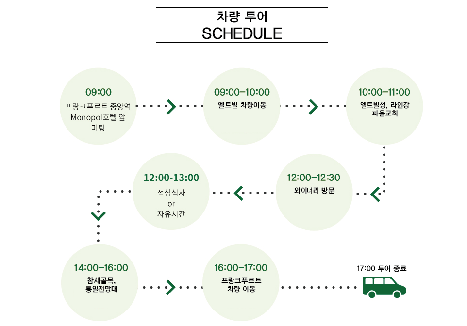 투어는 마인츠에서 종료되며 프랑크푸르트중앙역가는 기차탑승 안내해드립니다.